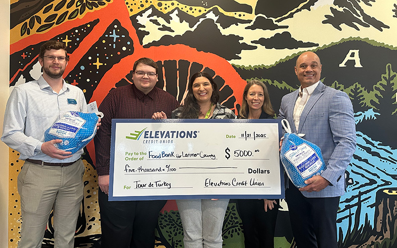 Elevations Credit Union has donated $5,000 to Food Bank for Larimer County’s Tour de Turkey food drive, in addition to a donation earlier this month of $25,000 to Community Food Share, which serves Boulder and Broomfield, Colo.